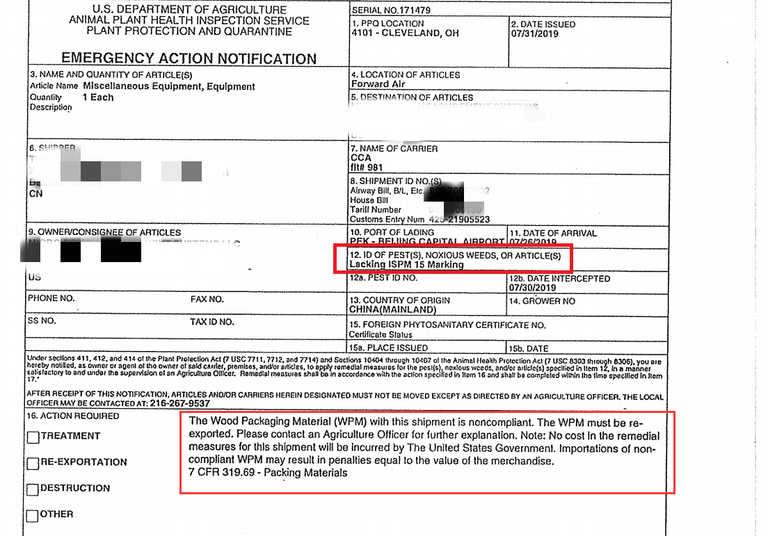 空運(yùn)貨物非實(shí)木的膠合板包裝發(fā)到美國,海關(guān)查貨后,發(fā)出下列通知,重點(diǎn)關(guān)于 第12部分, 和第16部分。
