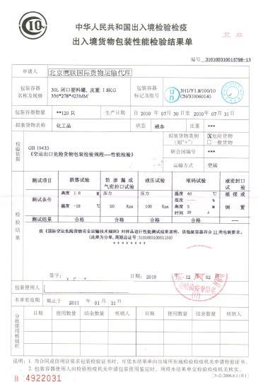 3. 有了產(chǎn)品報告,有了包裝的報告,就可以申請出證了,這個證就是出口報關需要的危包證。 示例如下