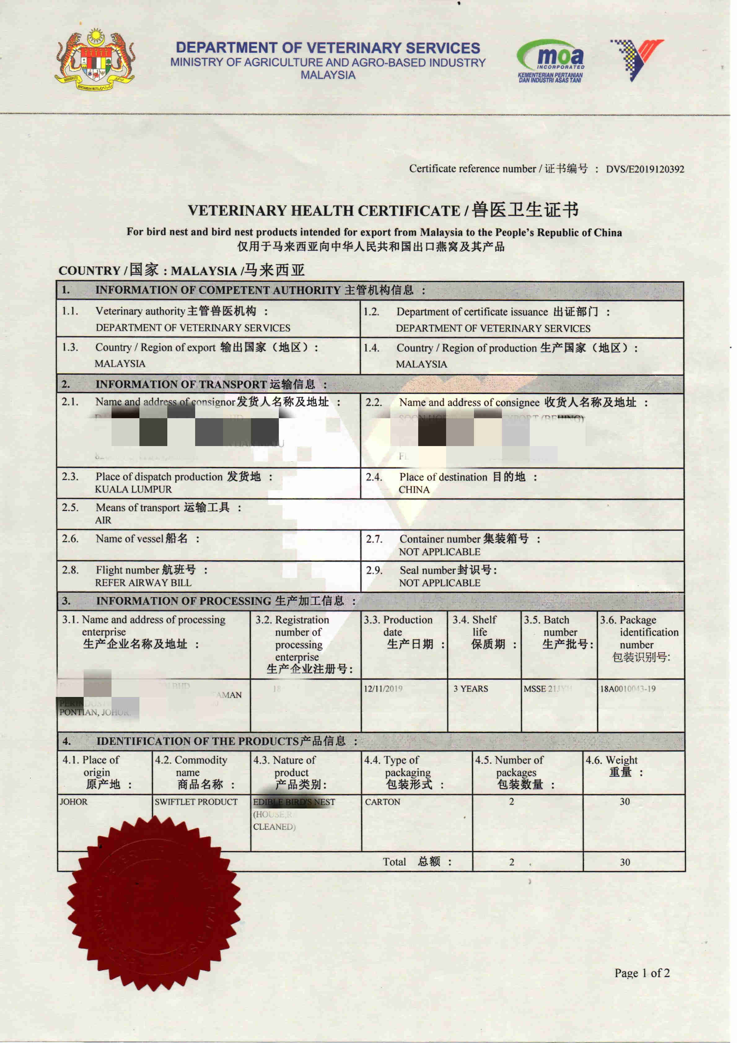 2. 獸醫(yī)衛(wèi)生證 (發(fā)貨人提供)