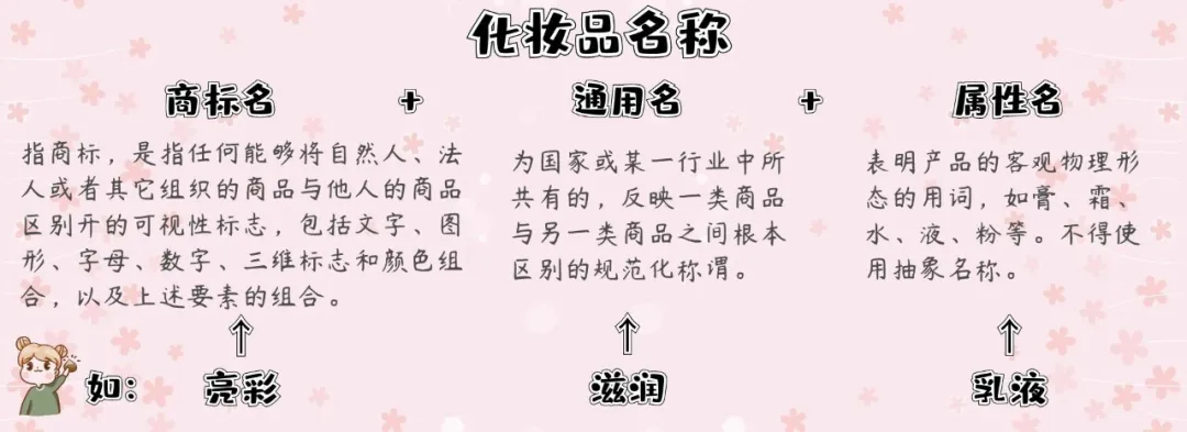 化妝品名稱一般由商標名、通用名和屬性名三部分組成。