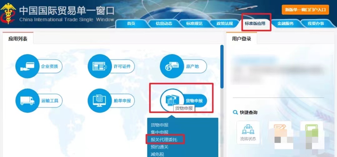 (1)企業(yè)用戶登錄中國國際貿(mào)易單一窗口門戶www.singlewindow.cn,如下圖所示:點擊【標準版應用】-【貨物申報】-【報關(guān)代理委托】進入,未登錄需插中國電子口岸IC卡登錄系統(tǒng)。
