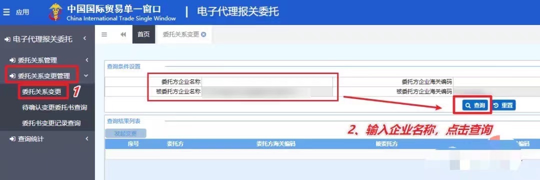 (2)點擊左側(cè)菜單【委托關(guān)系變更管理】-【委托關(guān)系變更】,收發(fā)貨人發(fā)起變更的:則在“被委托方企業(yè)名稱”輸入報關(guān)行全稱,點擊查詢;報關(guān)企業(yè)發(fā)起變更的:則在“委托方企業(yè)名稱”輸入收發(fā)貨人全稱,點擊查詢。