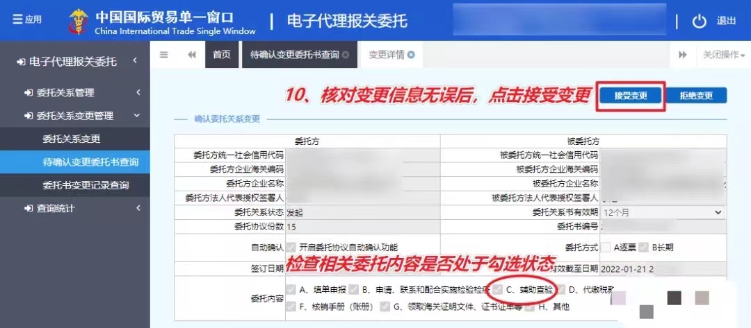 (6)在待確認變更委托書查詢的界面中檢查相關(guān)委托內(nèi)容是否處于勾選狀態(tài),核對變更信息無誤后,點擊接受變更。