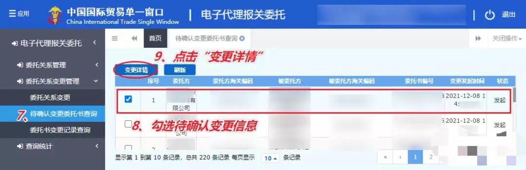 (5)點擊【待確認變更委托書查詢】,在待確認變更委托書查詢界面中勾選待確認變更信息的企業(yè),點擊變更詳情。