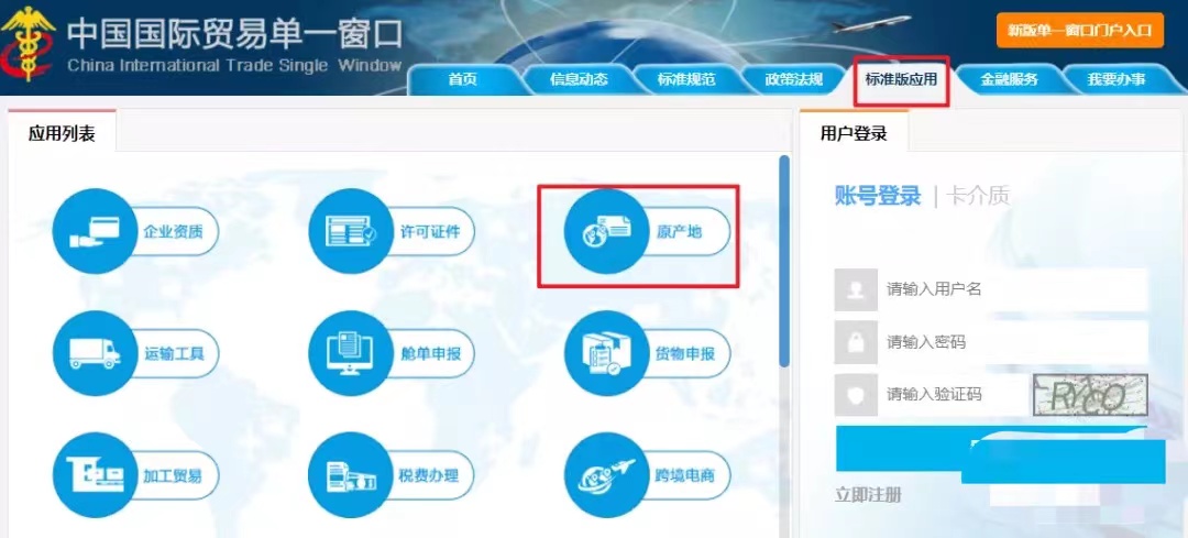 注冊(cè)或登陸成功后,進(jìn)入“標(biāo)準(zhǔn)版應(yīng)用”版面中的“原產(chǎn)地”模塊中的“原產(chǎn)地綜合服務(wù)平臺(tái)”,進(jìn)行企業(yè)備案申請(qǐng)。