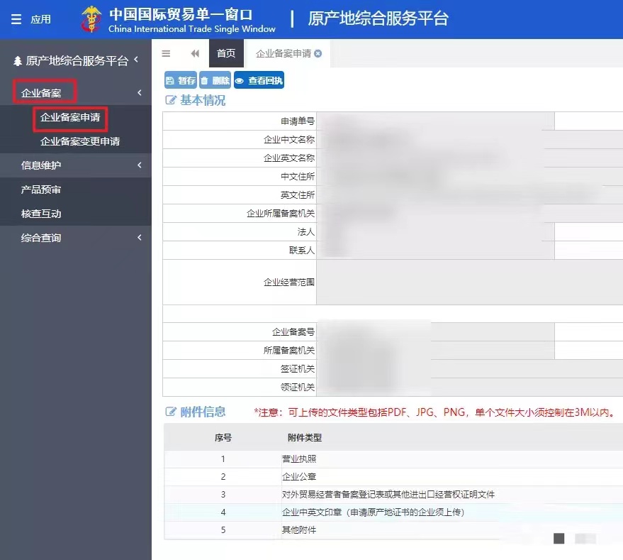 營(yíng)業(yè)執(zhí)照、對(duì)外貿(mào)易經(jīng)營(yíng)者登記表、企業(yè)公章、企業(yè)中英文印章(在原產(chǎn)地證書(shū)上的出口商聲明欄使用的企業(yè)中英文對(duì)照簽證章,可自行刻制)上傳電子文檔資料,單個(gè)文件大小在3M以內(nèi)。