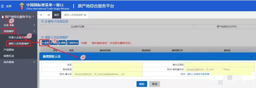 點(diǎn)擊菜單中的“信息維護(hù)”→“授權(quán)人員信息維護(hù)”→“+新增”,填報(bào)授權(quán)人員信息: