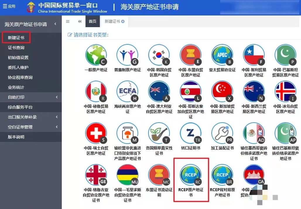 點(diǎn)擊左側(cè)菜單欄“新建證書(shū)”,選擇“RCEP原產(chǎn)地證書(shū)”。