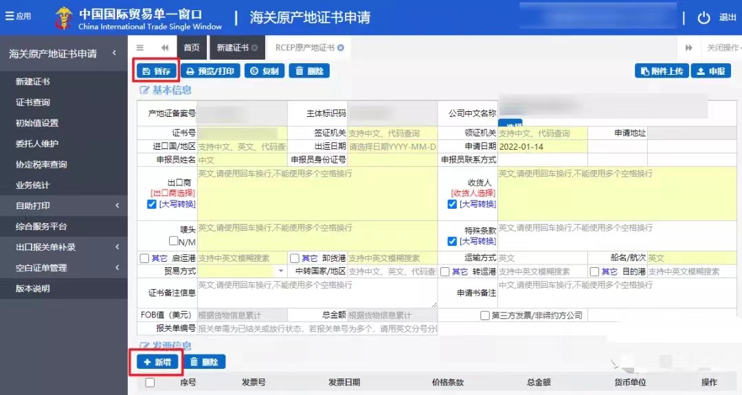 基本信息錄入完成后,點(diǎn)擊“暫存”保存基本信息。發(fā)票信息處,點(diǎn)擊“新增”。