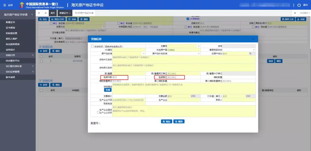 注意:圈紅的“包裝件數(shù)”“包裝單位”字段雖為白色,也是必填項(xiàng)。“貨物描數(shù)”字段可以不用手動(dòng)錄入,在其他字段錄入完成后點(diǎn)擊“生成”即可。